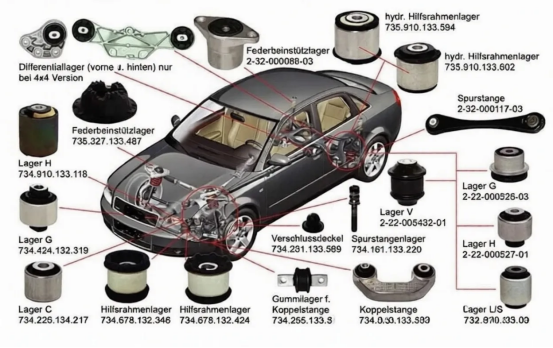 1. Sistem de suspensie:În suspensie, bucșele de cauciuc servesc la conectarea componentelor, la absorbția șocurilor și la menținerea alinierii precise - îmbunătățind atât manevrabilitatea vehiculului, cât și confortul de rulare.